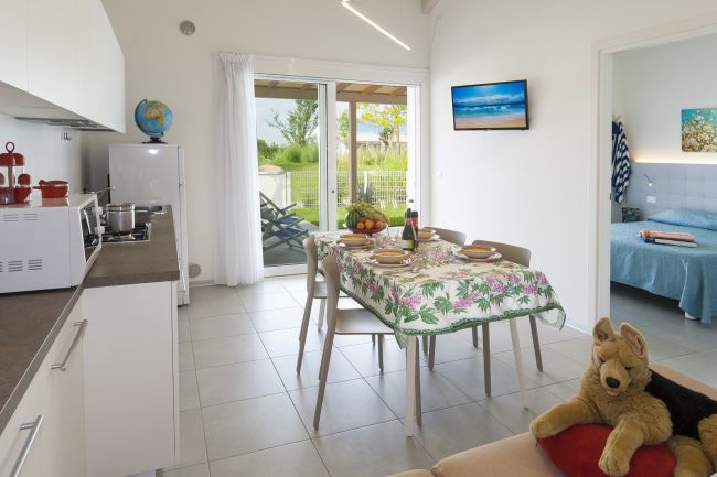 7 posti letto, all'interno della pineta di 41 mq con cucina, lavastoviglie, soggiorno con divano letto, camera matrimoniale, 2 stanze con 2 letti, 2 bagni con doccia, veranda esterna attrezzata e barbecue